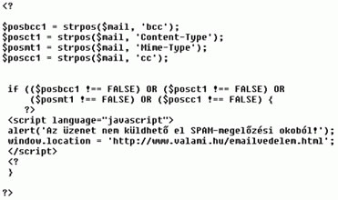 A teendő nem más, mint egy PHP utasítássorozat segítségével ellenőrizni, hogy szerepelnek-e ezek a kifejezések az űrlapmezők bármelyikében (ez alól kivételt képez az üzenet szövegét tartalmazó mező). Tehát a feladóra vonatkozó információk és esetlegesen a téma megjelölésére szolgáló szövegbeviteli mezőket kell ellenőrizni akkor, amikor már azok változókban vannak tárolva, majd pedig ha bármelyik is „megbukott a teszten”, megakadályozni az üzenetküldési folyamat lefutását.
